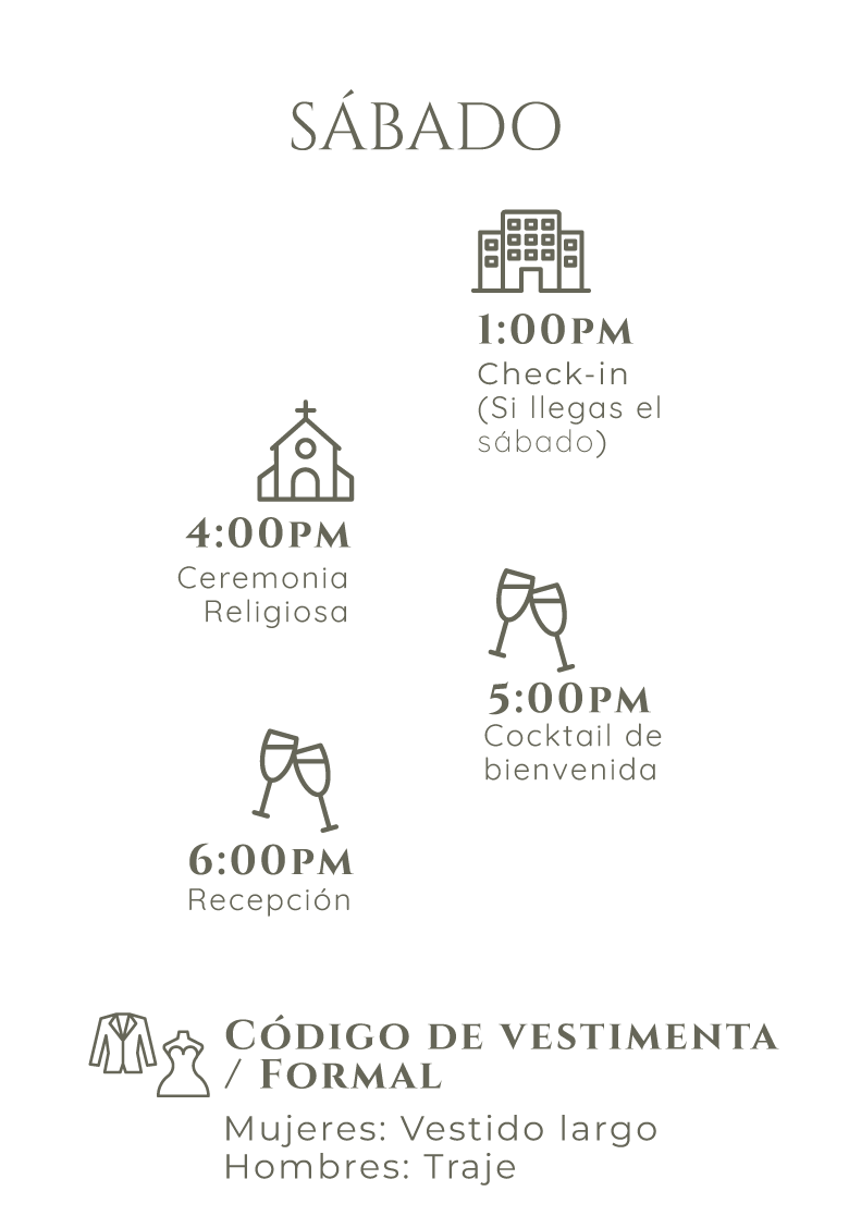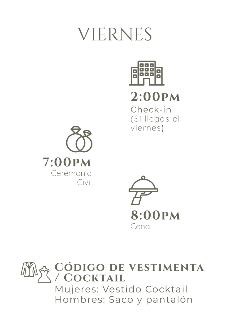 Queremos celebrar contigo a lo grande y sin preocupaciones. Por eso, todas las celebraciones tendrán lugar en la Hacienda. Puedes elegir si deseas llegar el viernes o el sábado; sólo indícalo en la casilla de abajo.